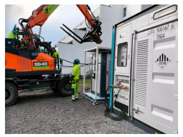 Atlas Copco Fast Charger arbejder sammen med ZBC-beholderens energilagringssystem til at fodre en elektrisk gravemaskine