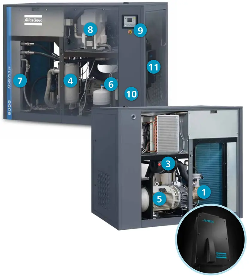 Atlas Copcos AQ VSD-teknologi sporer ændringer i kundernes gasforbrug og justerer kompressorhastigheder i realtid, hvilket opnår gennemsnitlige energibesparelser på op til 35 procent og samlede livscyklusomkostningsbesparelser på cirka 22 procent.