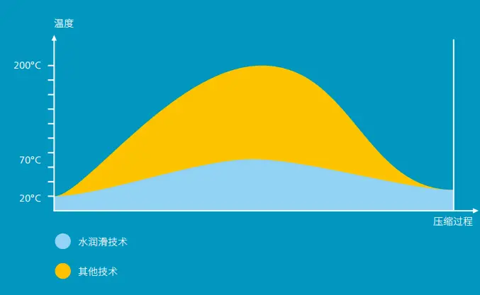Vand har fremragende køleeffekt og fjerner effektivt varme fra kilden. Energispild forårsaget af varmegenerering elimineres, og der kan produceres mere trykluft pr. kilowatt energi. Den køligere trykluft reducerer termisk belastning på komponenterne og forlænger derved levetiden.