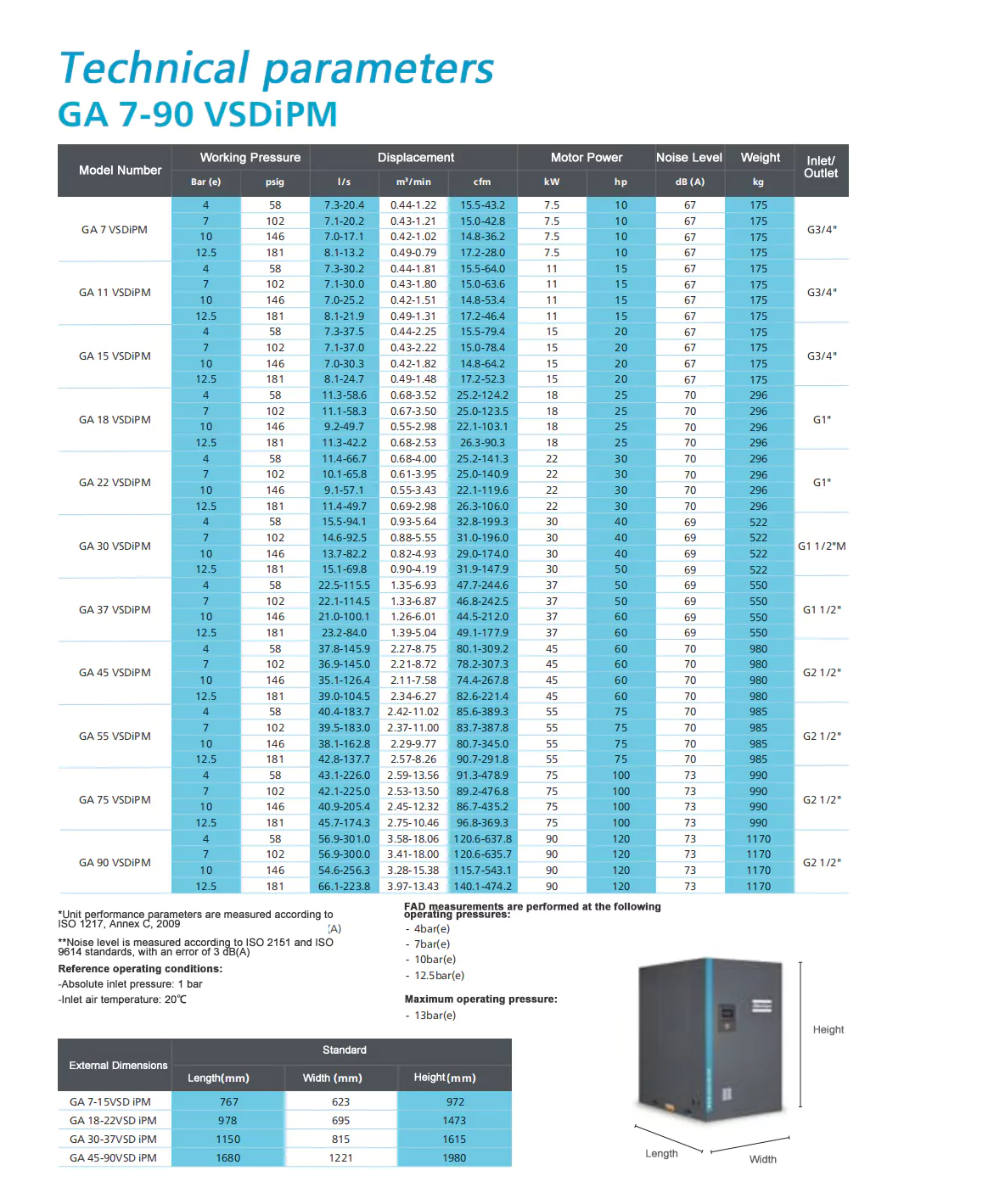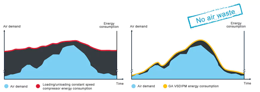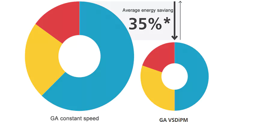 Atlas Copcos VSDiPM-serie kan automatisk justere motorhastigheden for præcist at kontrollere og imødekomme kundernes behov for gasforbrug. Sammenlignet med kompressorer drevet af den specificerede hastighed sparer VSD variabel frekvens luftkompressor i gennemsnit op til 35 % energi.